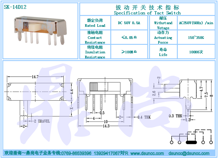產(chǎn)品名稱:Horizontal Slide Switch 產(chǎn)品型號:SK-14D12