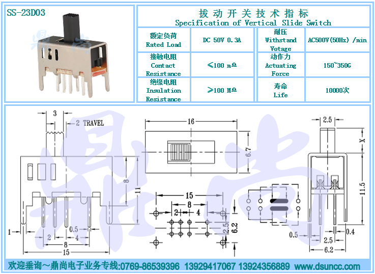 圖紙下載 產(chǎn)品型號: SS-23D03(2P3T) 產(chǎn)品名稱:立式三檔撥動開關(guān)