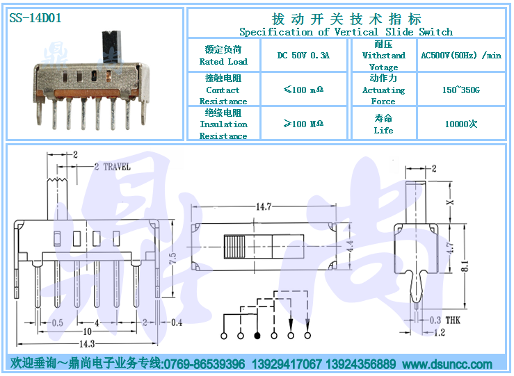圖紙下載 產(chǎn)品型號: SS-14D01(1P4T) 產(chǎn)品名稱:立式四檔撥動開關(guān)